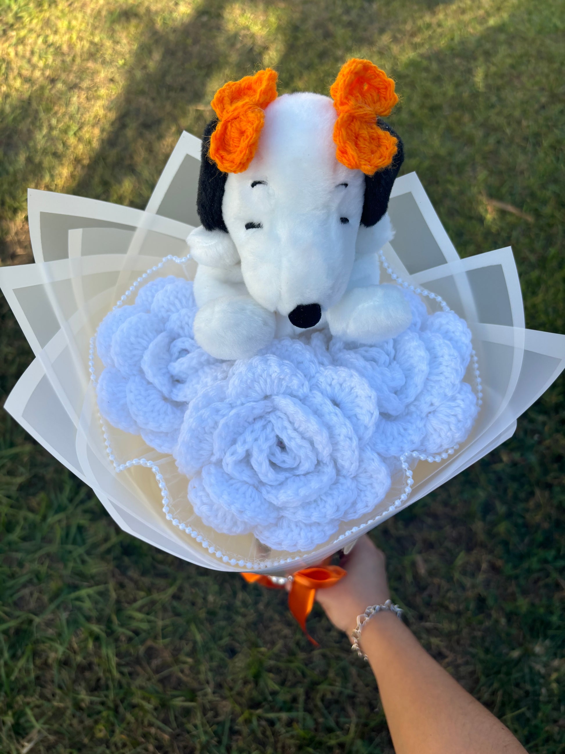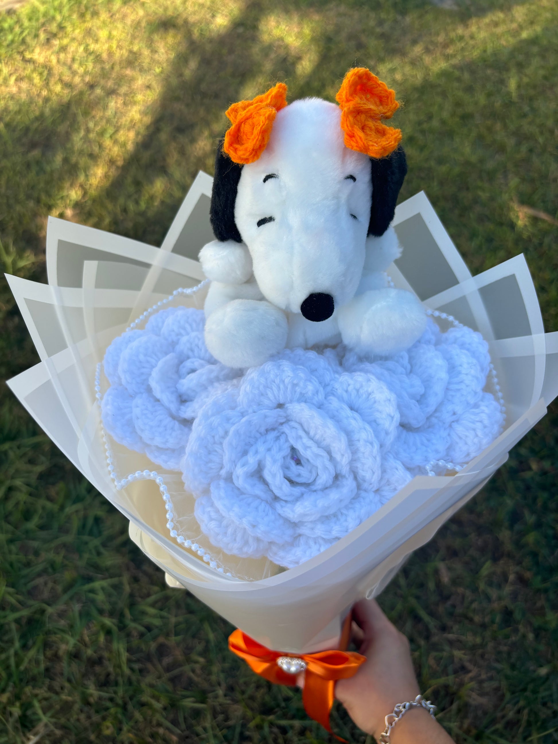 Our Halloween Snoopy Bouquet comes with 3 white flowers, Snoopy plushie, orange bows ( 2 of them crochet) , white pearl mesh and white wrapping.