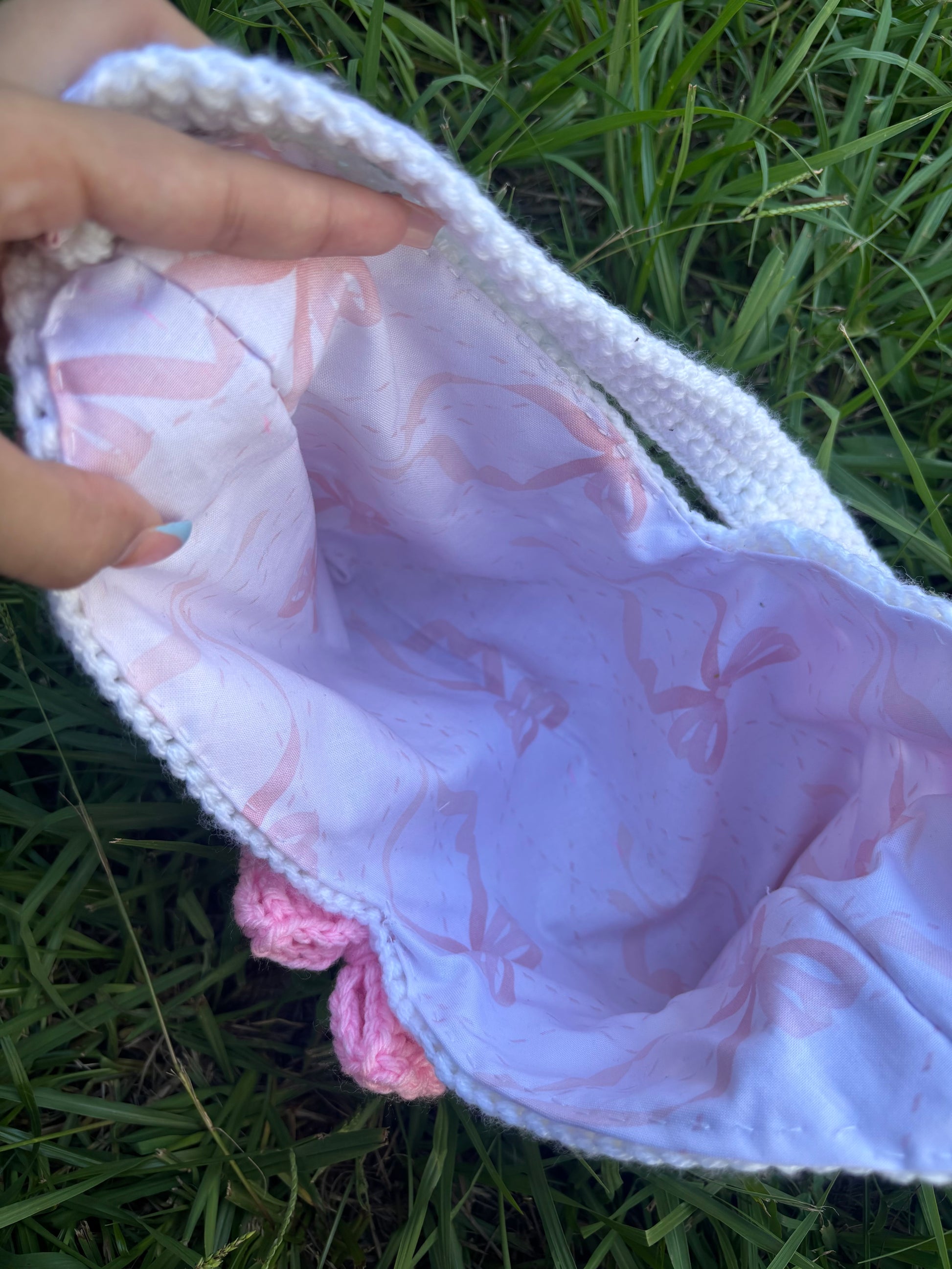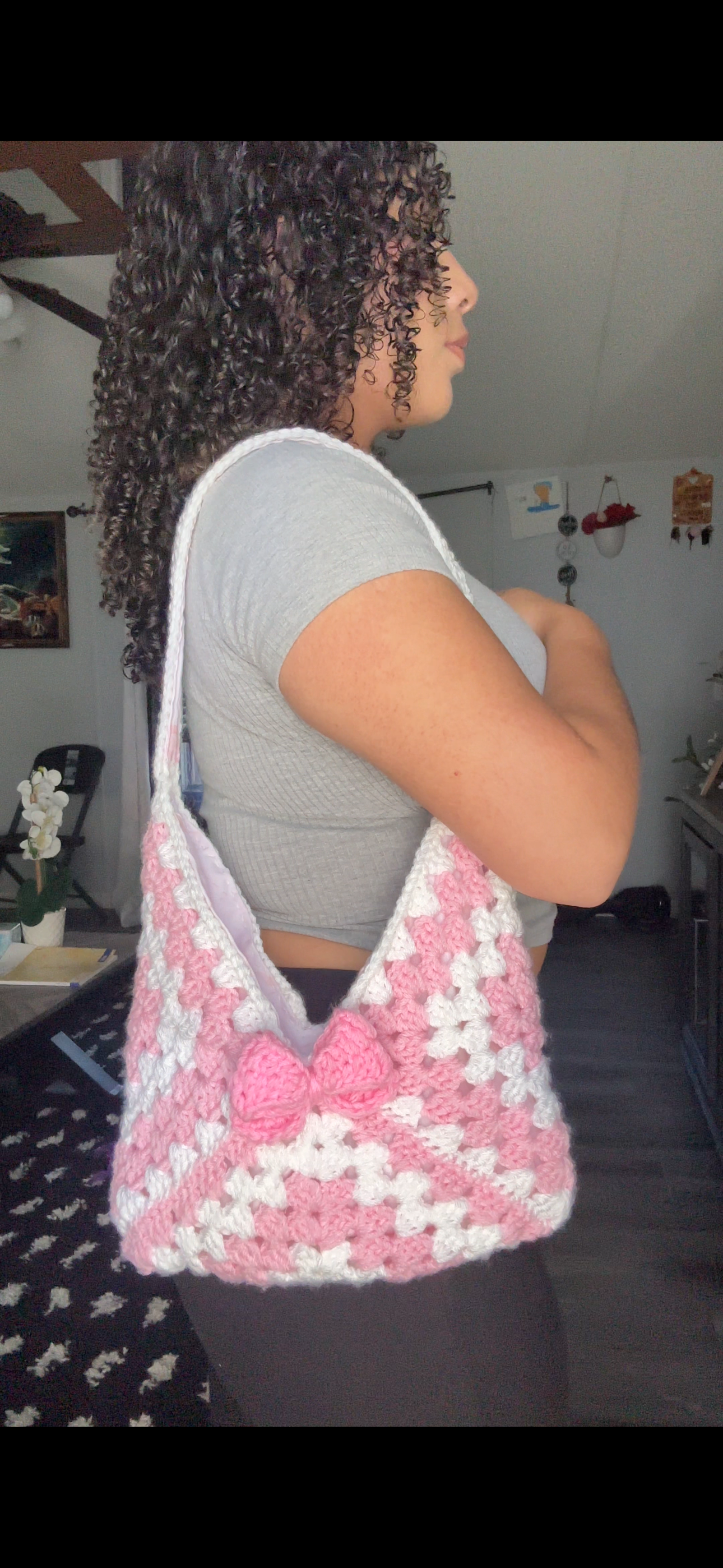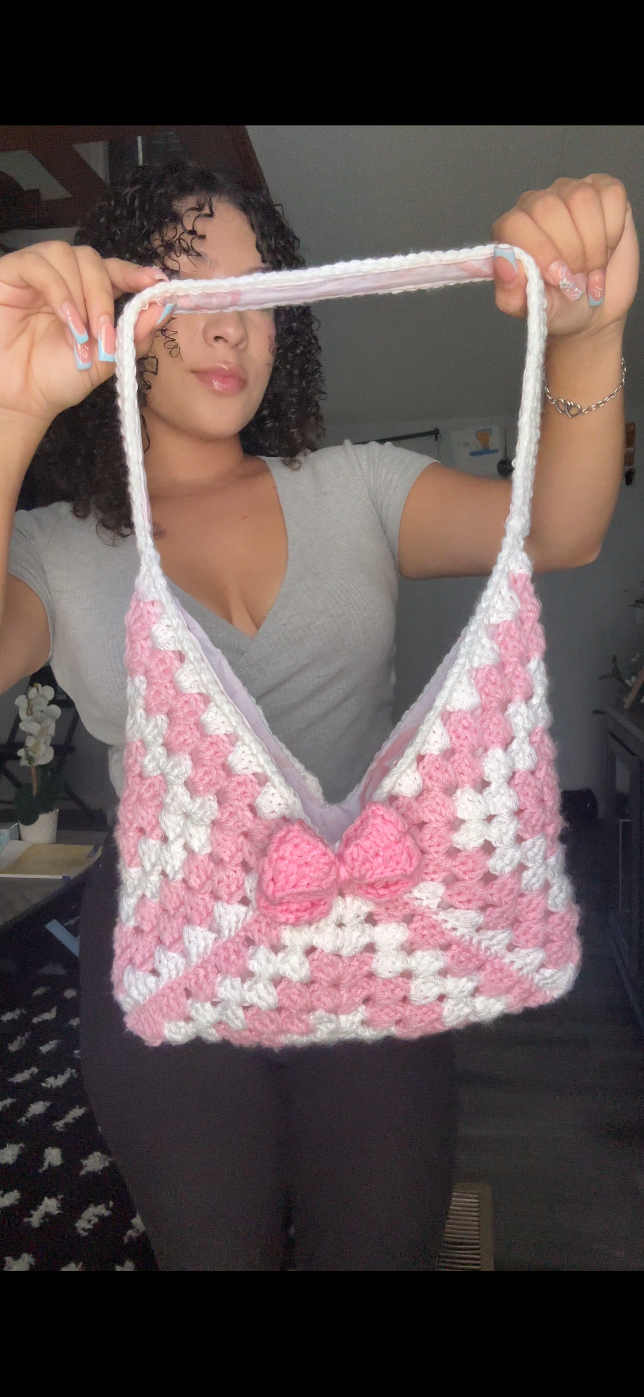 Our Coquette Bag is made of 3 big granny squares with the color white and pink. It has a darker pink bow in the center, adding more cuteness. The straps and the inside come with bow print lining to give more support to the bag. Our Coquette bag is 11x11 in. The straps are 20in long.