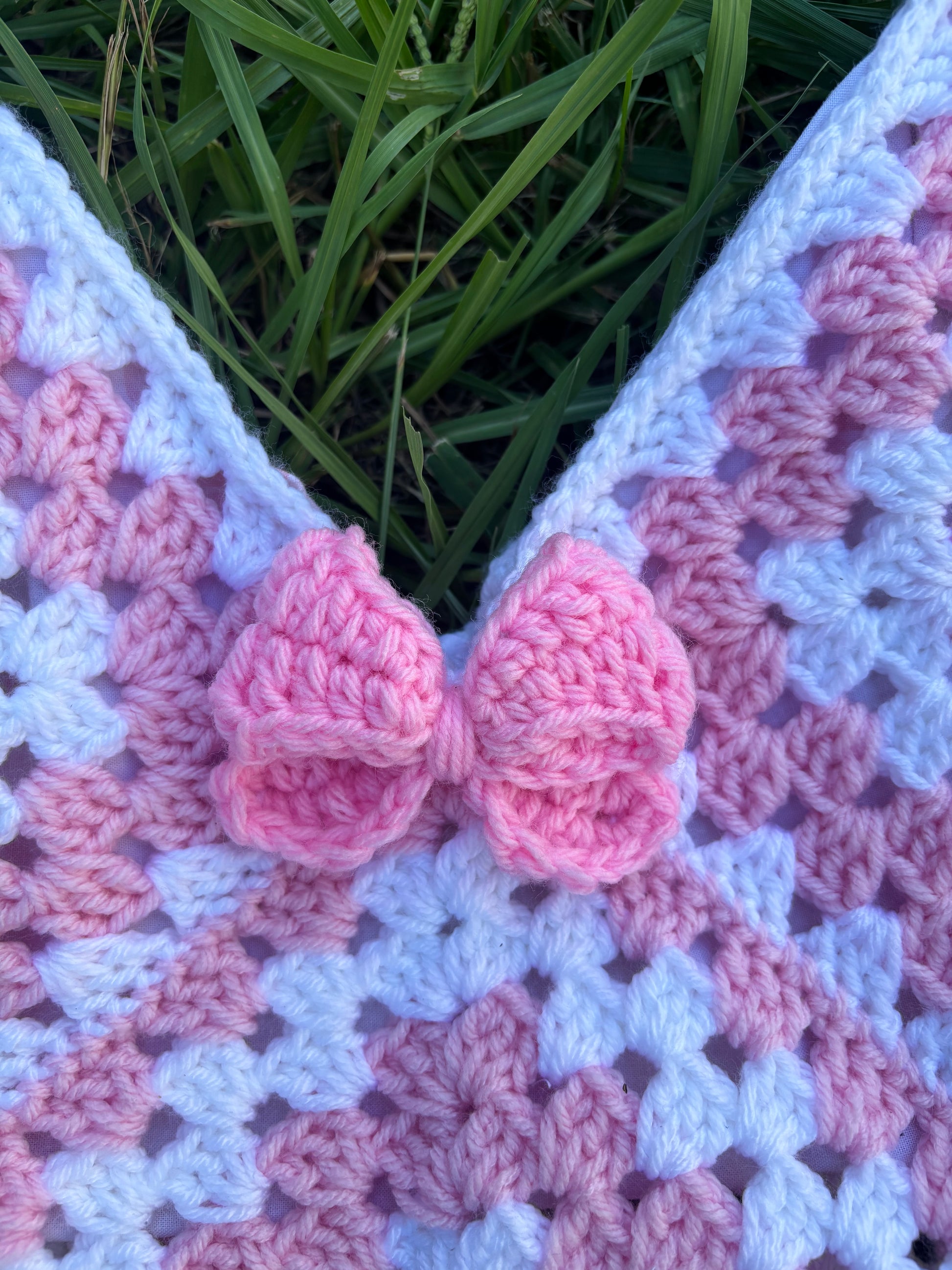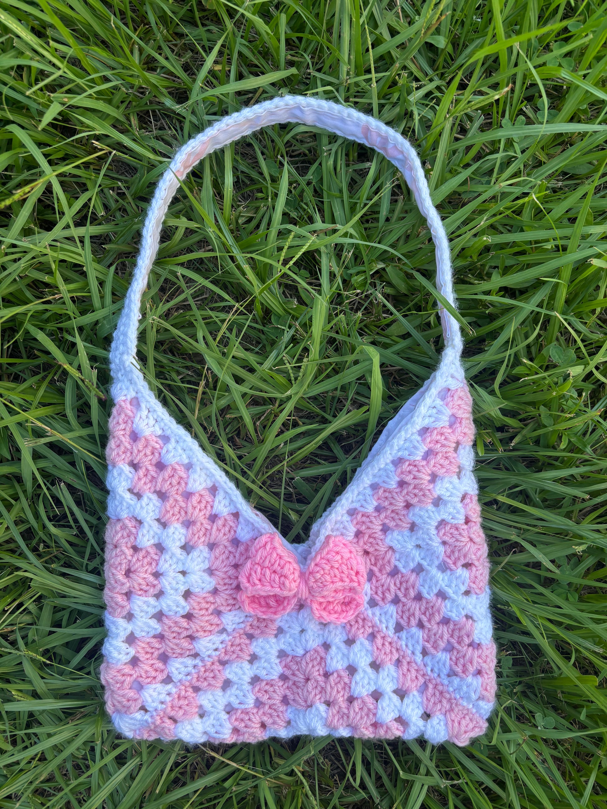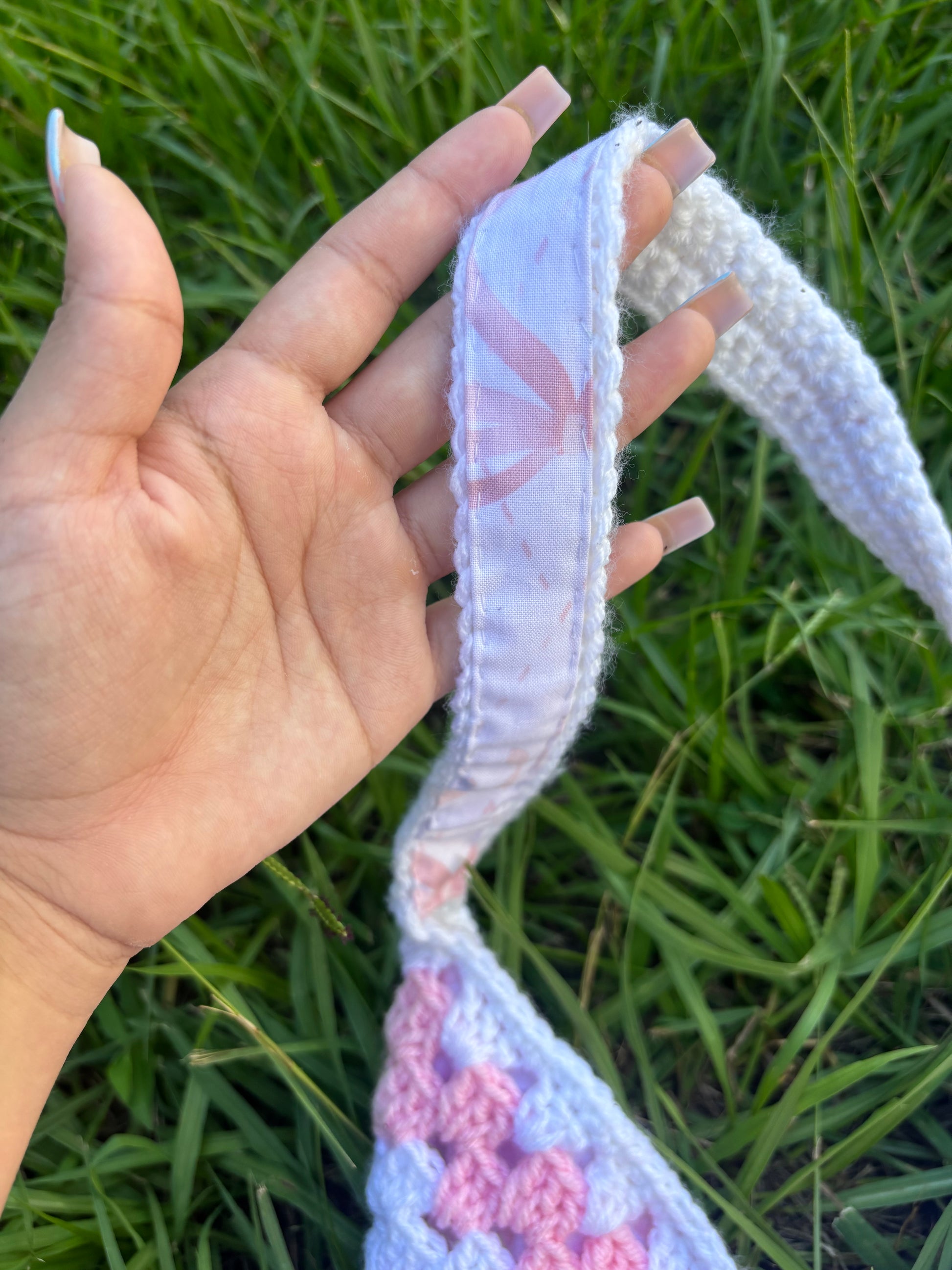 Our Coquette Bag is made of 3 big granny squares with the color white and pink. It has a darker pink bow in the center, adding more cuteness. The straps and the inside come with bow print lining to give more support to the bag. Our Coquette bag is 11x11 in. The straps are 20in long.