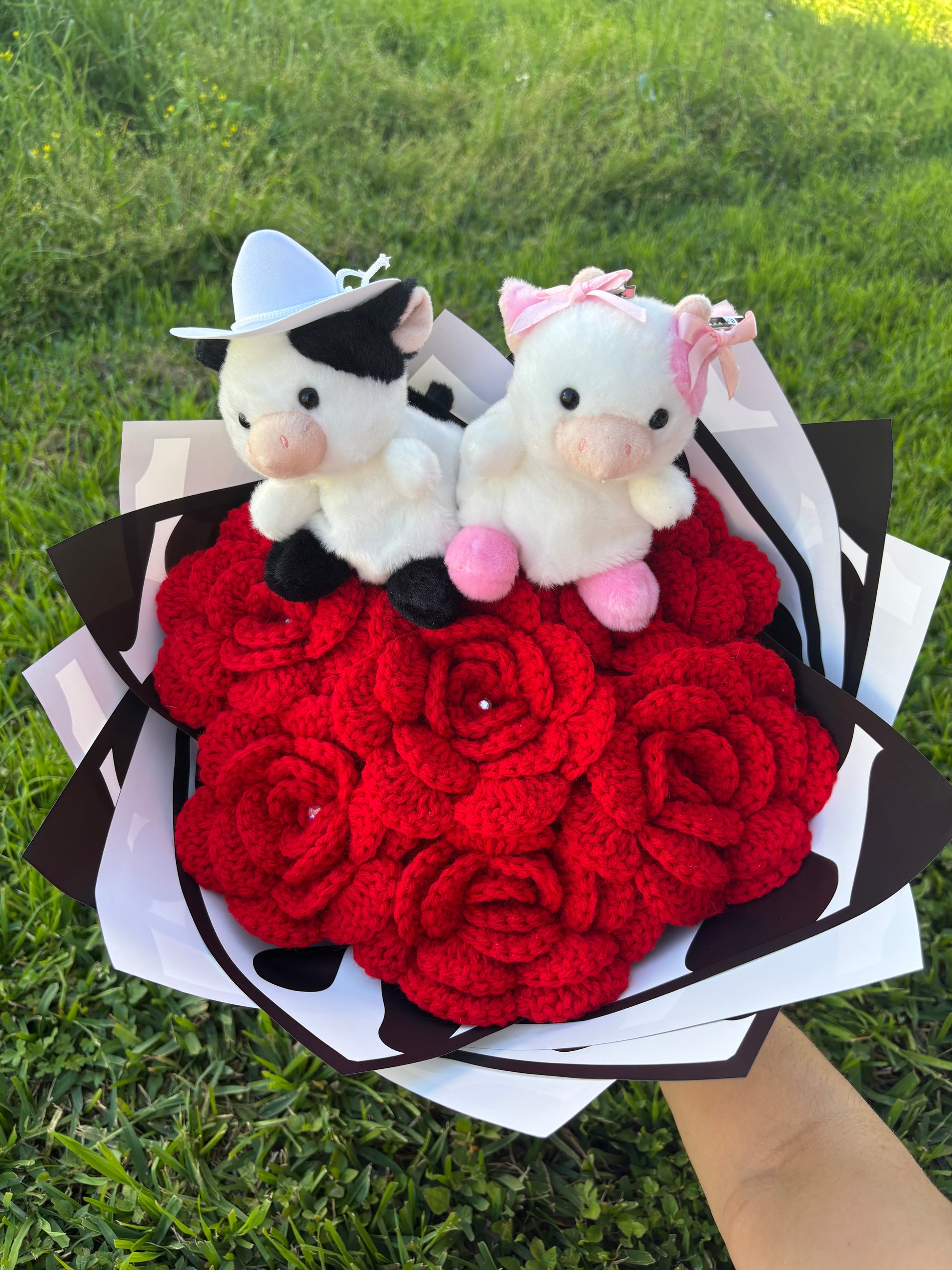Our Cow Couple Bouquet comes with 6 red flowers, 2 cow plushies (one black with cowboy hat, one pink with pink bows), and Black Cow Print wrapping paper.