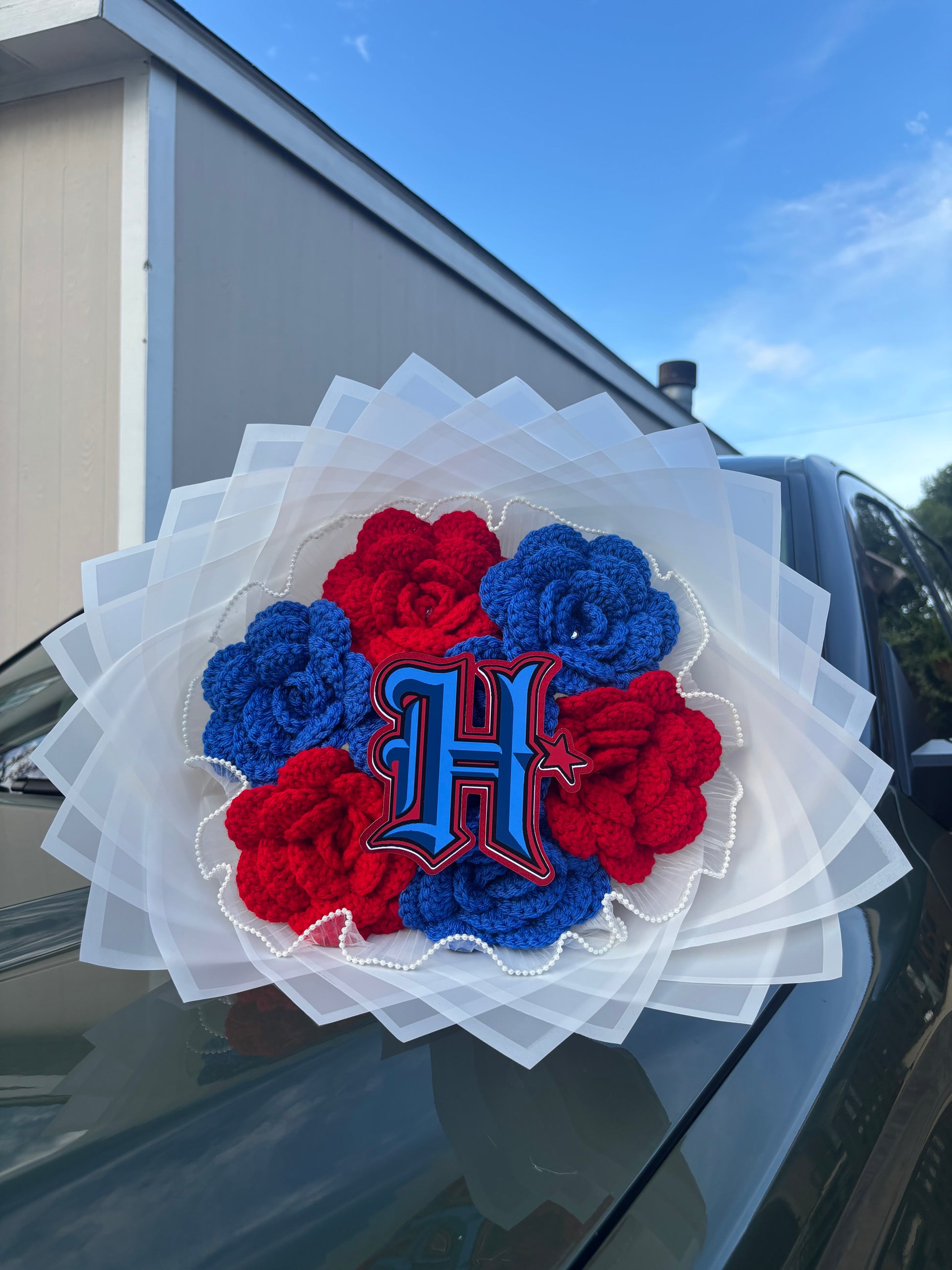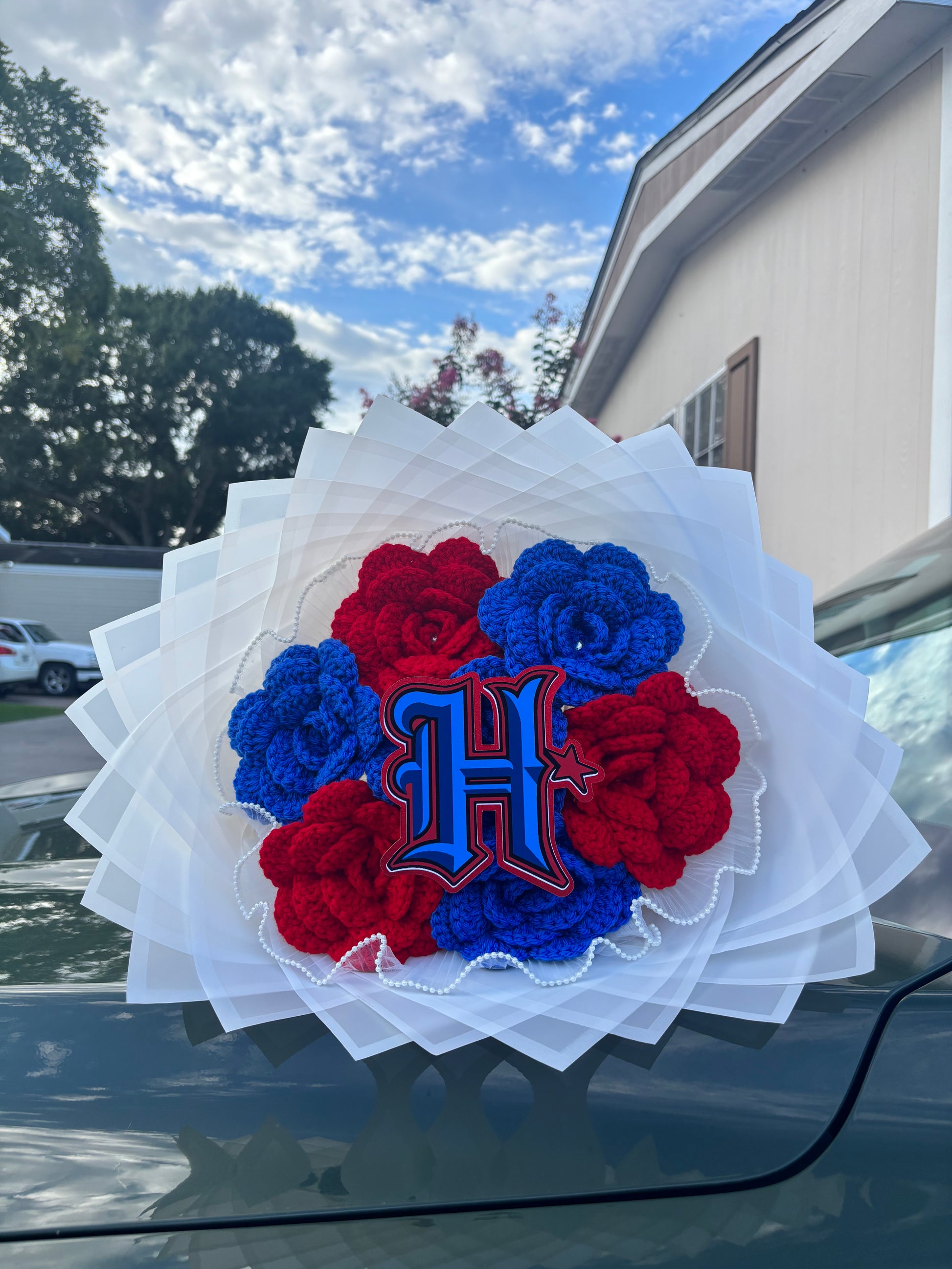 Our Houston Bouquet comes with 7 flowers (4 blue, 3 red), Houston Logo, white pearl mesh, and white wrapping.