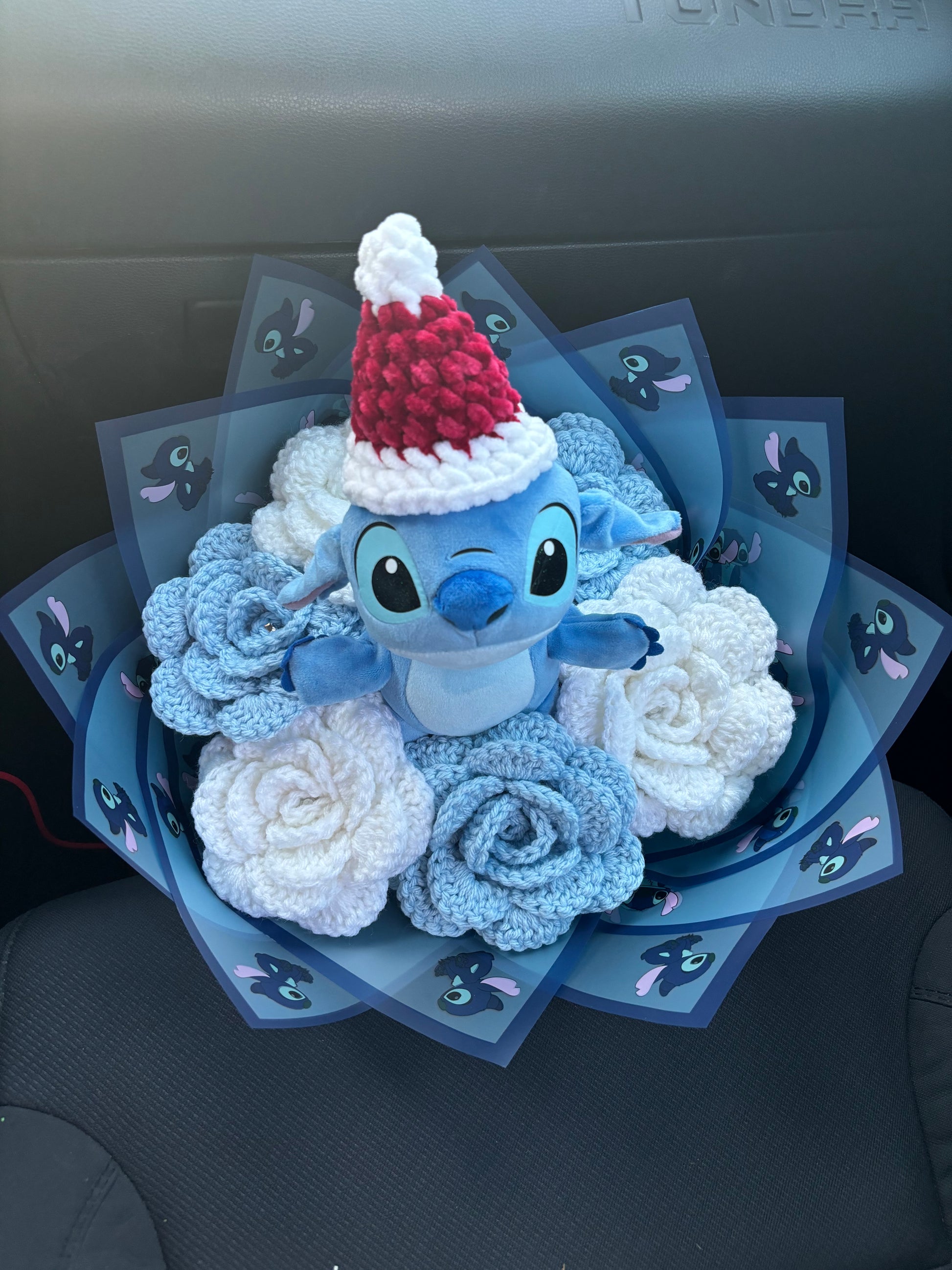 Our Christmas Stitch Bouquet comes with 6 crochet flowers (3 white, 3 baby blue), red crochet santa hat, Stitch plushie and Stitch wrapping paper.