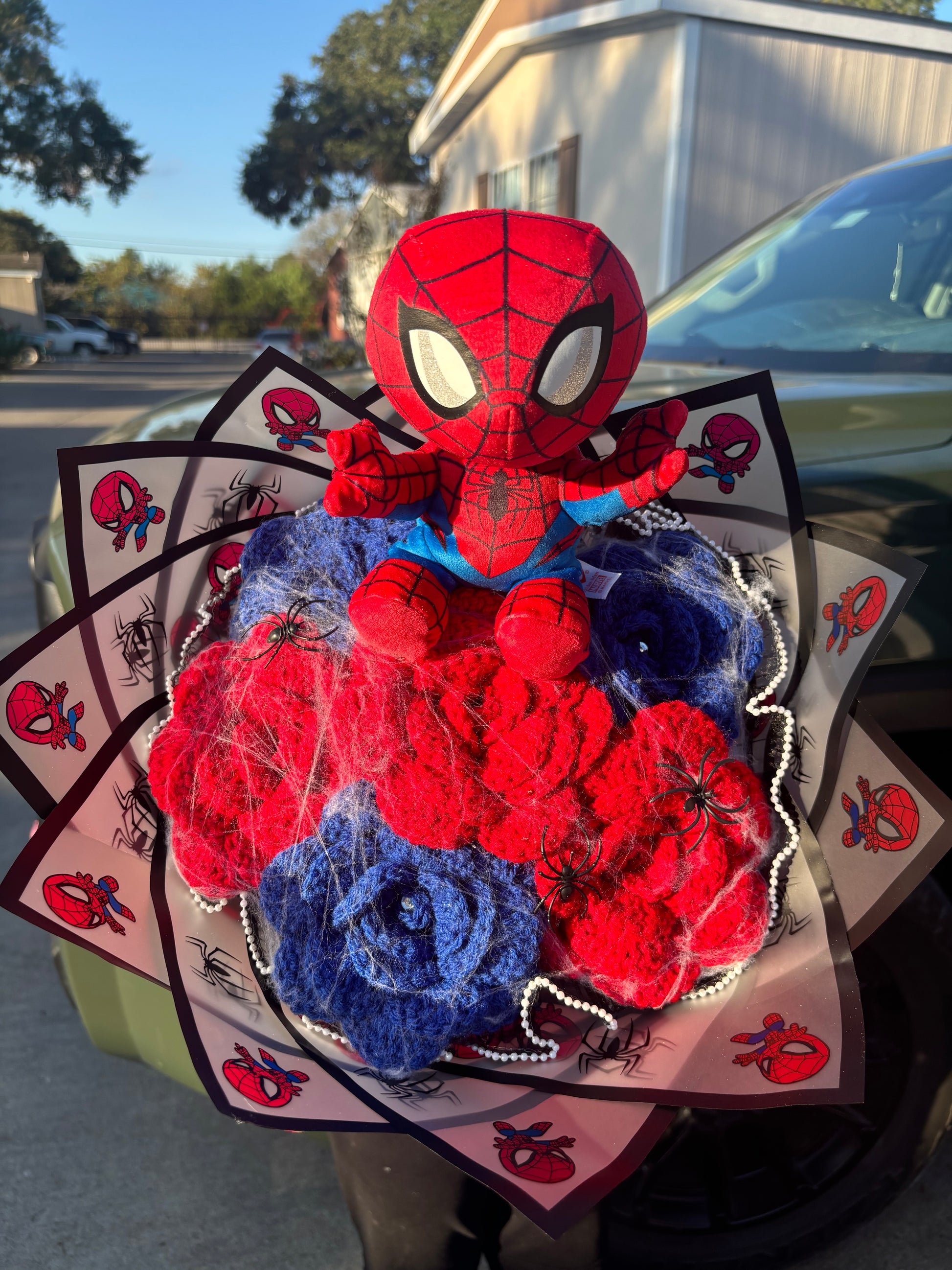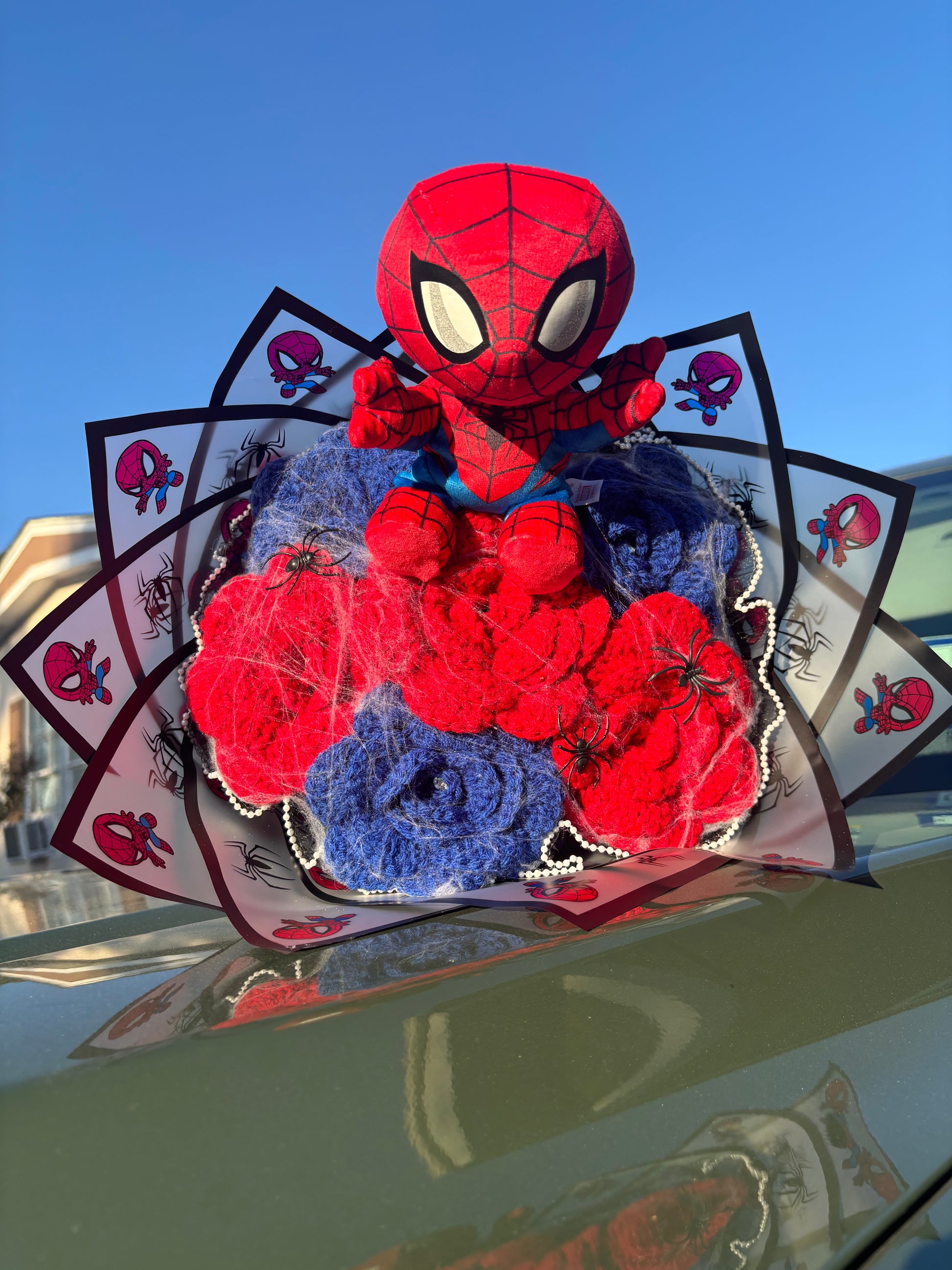 Our Spiderman Bouquet comes with 6 flowers (3 red, 3 blue), spider web, small artificial spiders, Spiderman plushie, black pearl mesh , and Spiderman wrapping paper.
